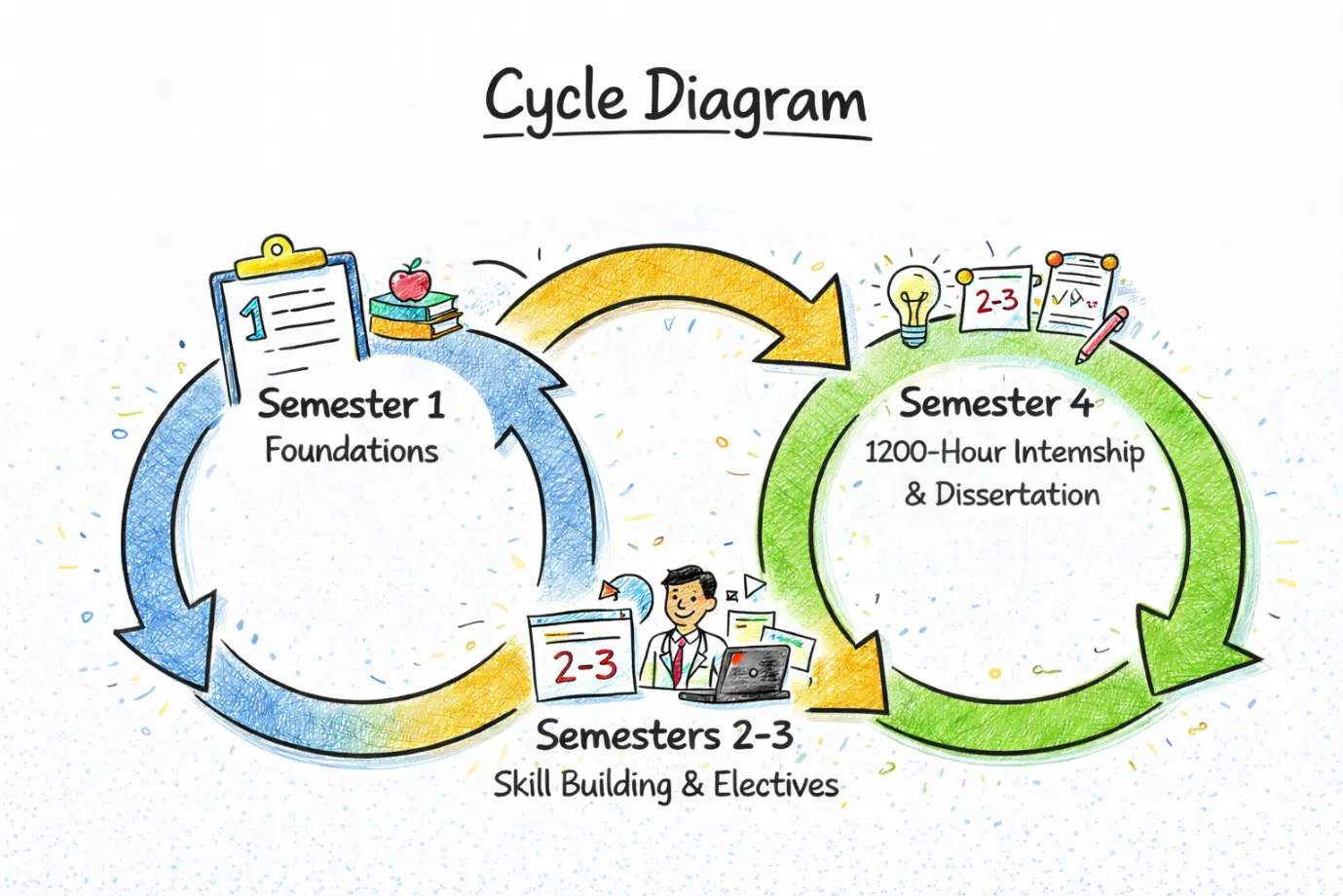 - Semester 4 Focus: The final semester is entirely dedicated to competency building through a structured internship and a compulsory research dissertation.