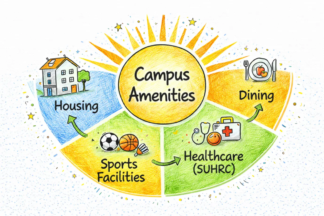 - Recreation: Students have access to a gymnasium, swimming pool, and courts for badminton, squash, and basketball.